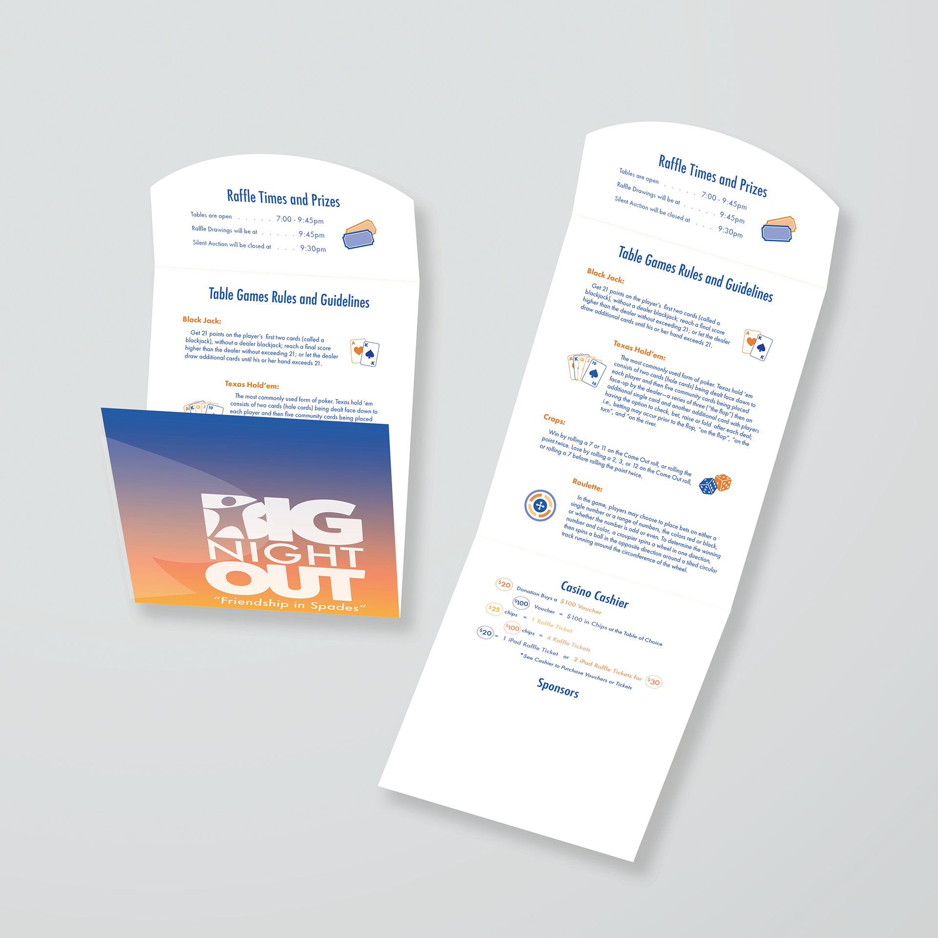 This branding project was created for Big Brothers Big Sisters of Flagstaff’s annual fundraising event, a casino night aimed at raising money and encouraging more mentors to join the program. I developed a cohesive visual identity for the event, including a custom logo, social media graphics, programs, tickets, posters, table toppers, and event presentations. The fresh, engaging design generated significant interest, leading to the highest attendance the event has seen to date.